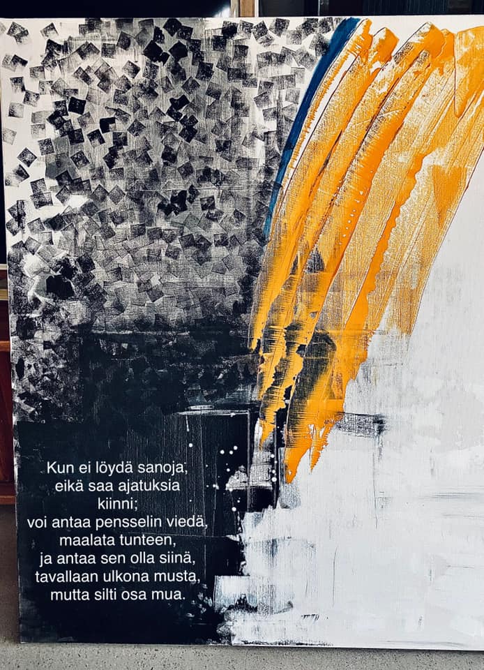 Olen oivaltanut vihdoin, että taide ja minä ollaan kietouduttu yhteen, enkä päästä luovaa puoltani enää karkuun tai koita sitä peitellä. Olen päättänyt olla enemmän läsnä, uskaltaa näyttää erityisherkkyyteni ja luottaa intuitioni voimaan. Olen saanut läheisiltäni valtavasti tukea ja rakkautta tämän vaikean vaiheen läpikäymiseen.