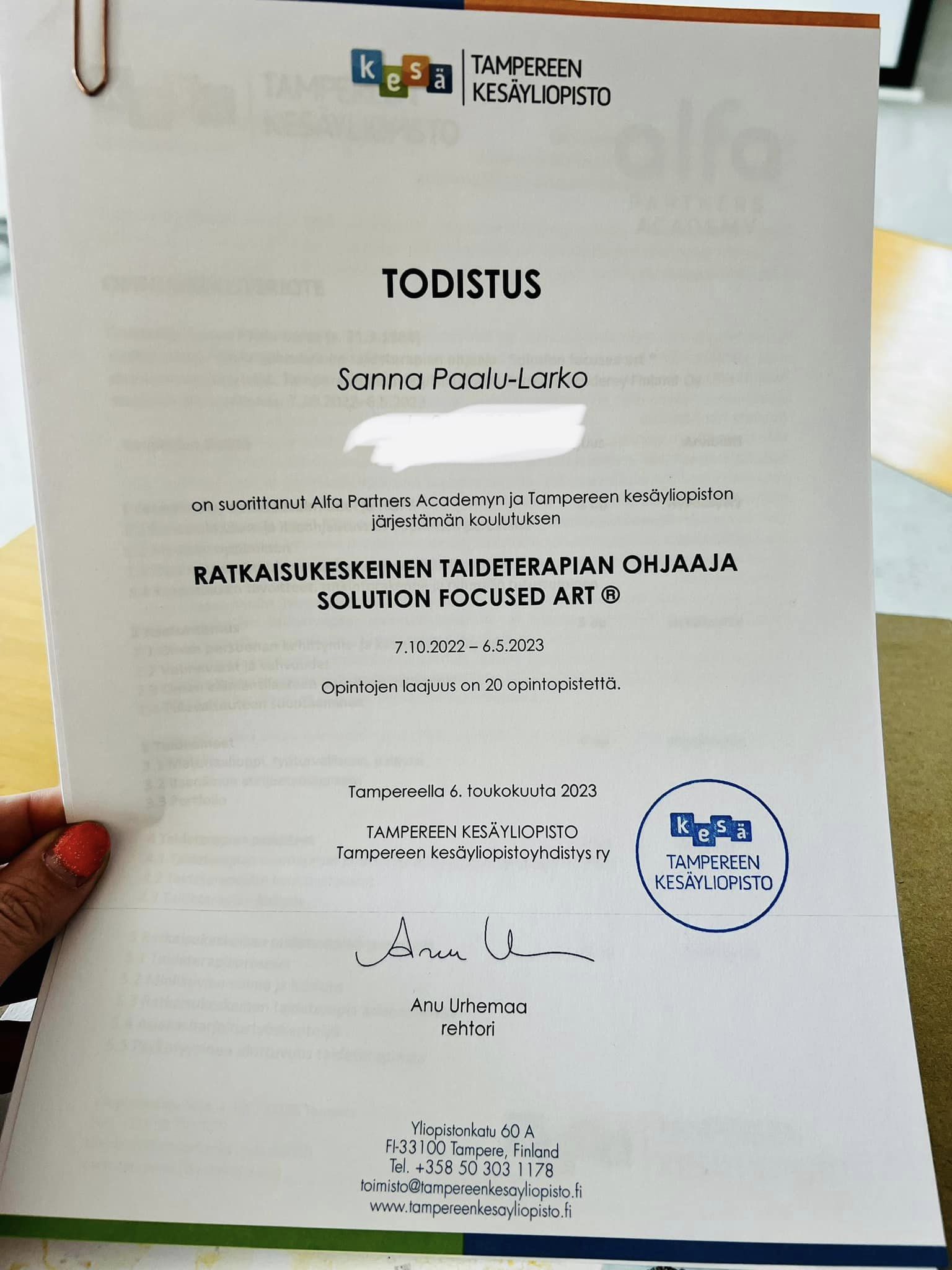 Jatkoin työssäni osa-aikaisena ja samalla taideterapiaopintojani Tampereella. Toukokuussa 23 valmistuinkin ratkaisukeskeiseksi taideterapiaohjaajaksi.