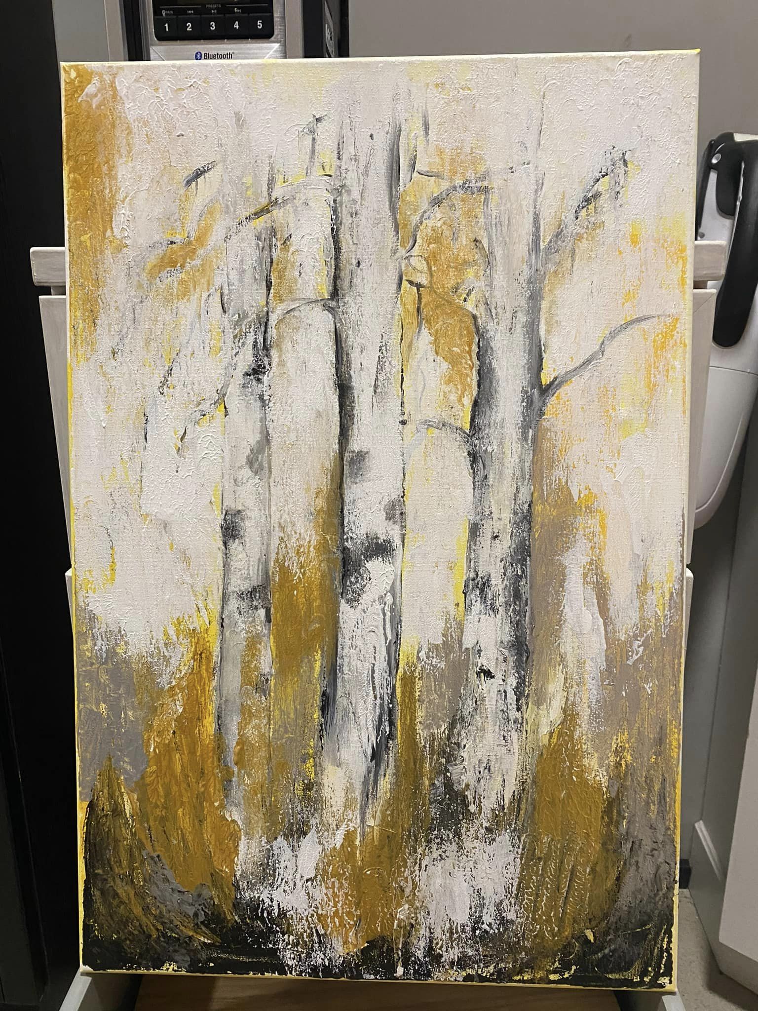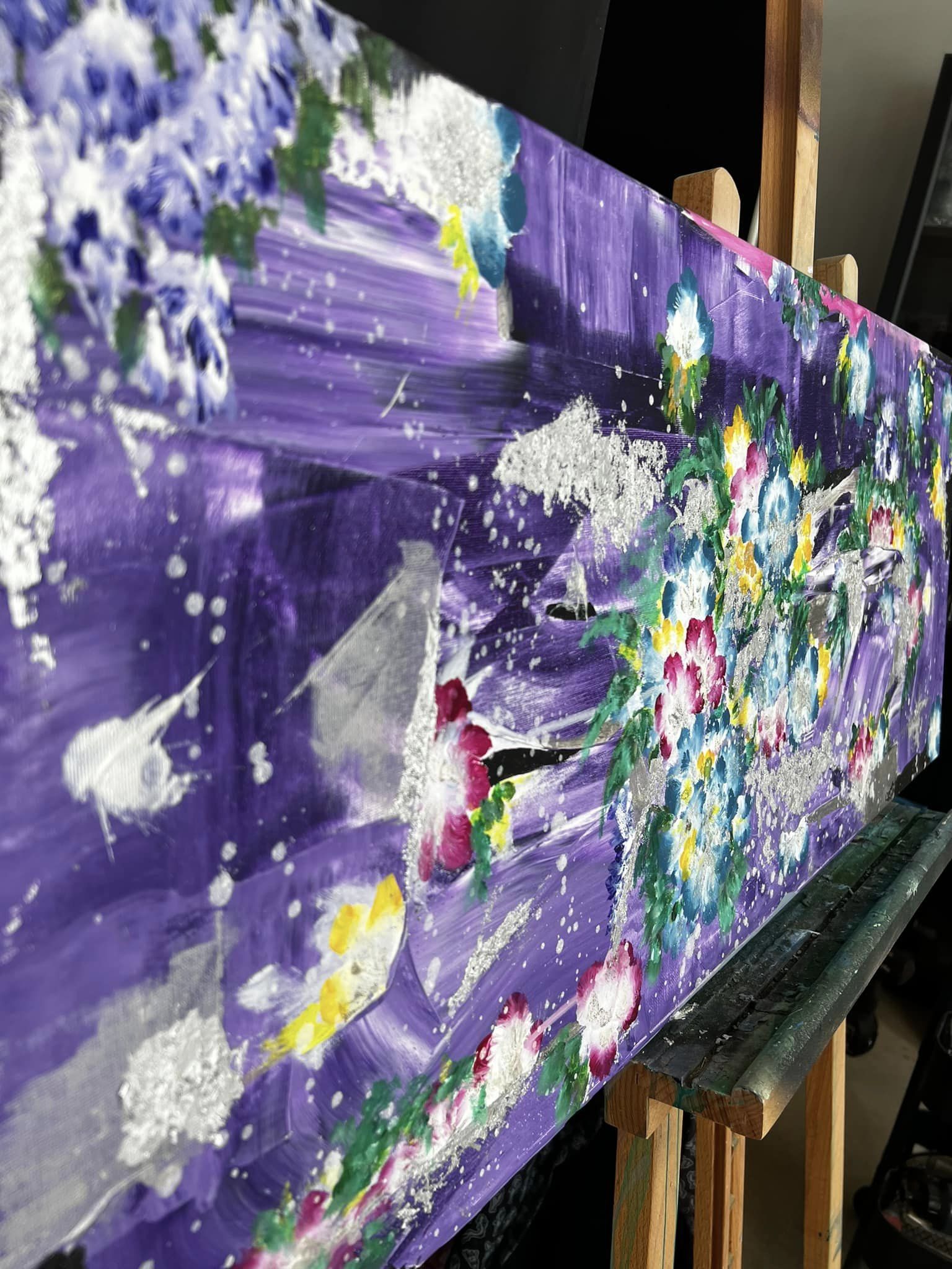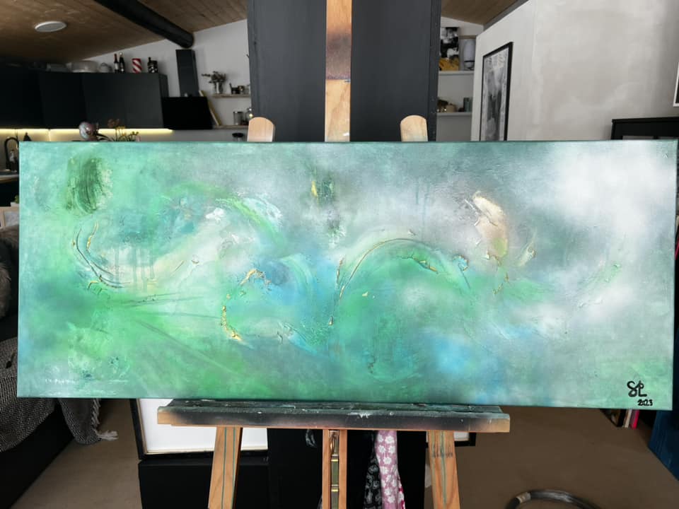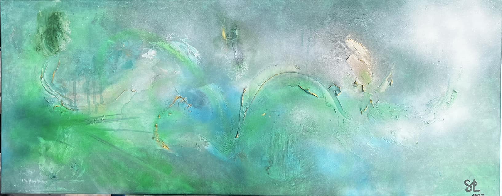 Spring. Mukana lehtihopeaa. Canvas. Akryyli. Koko 40×100.