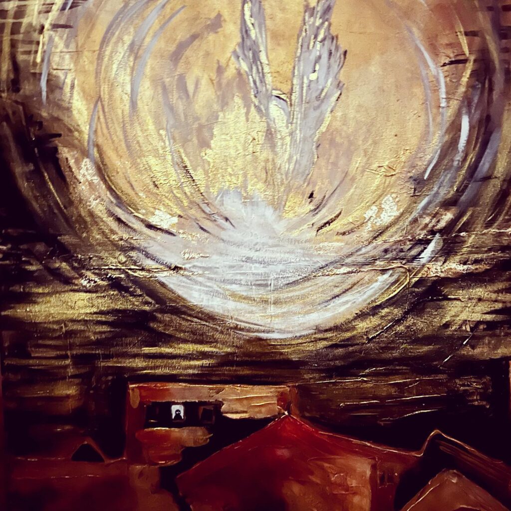 Kattojen yllä. Akryyli/sekatekniikka. Mukana lehtikultaa. 60×80.