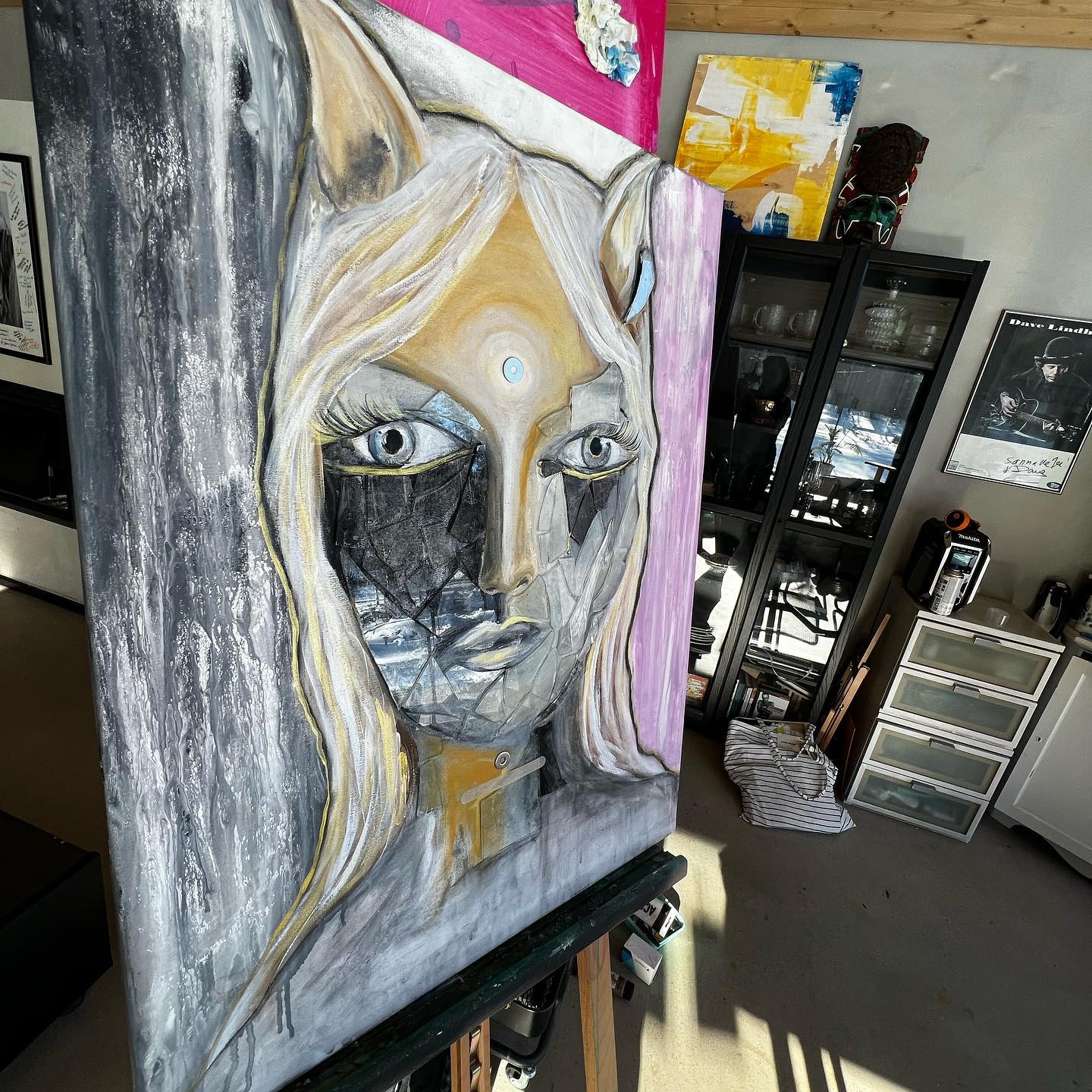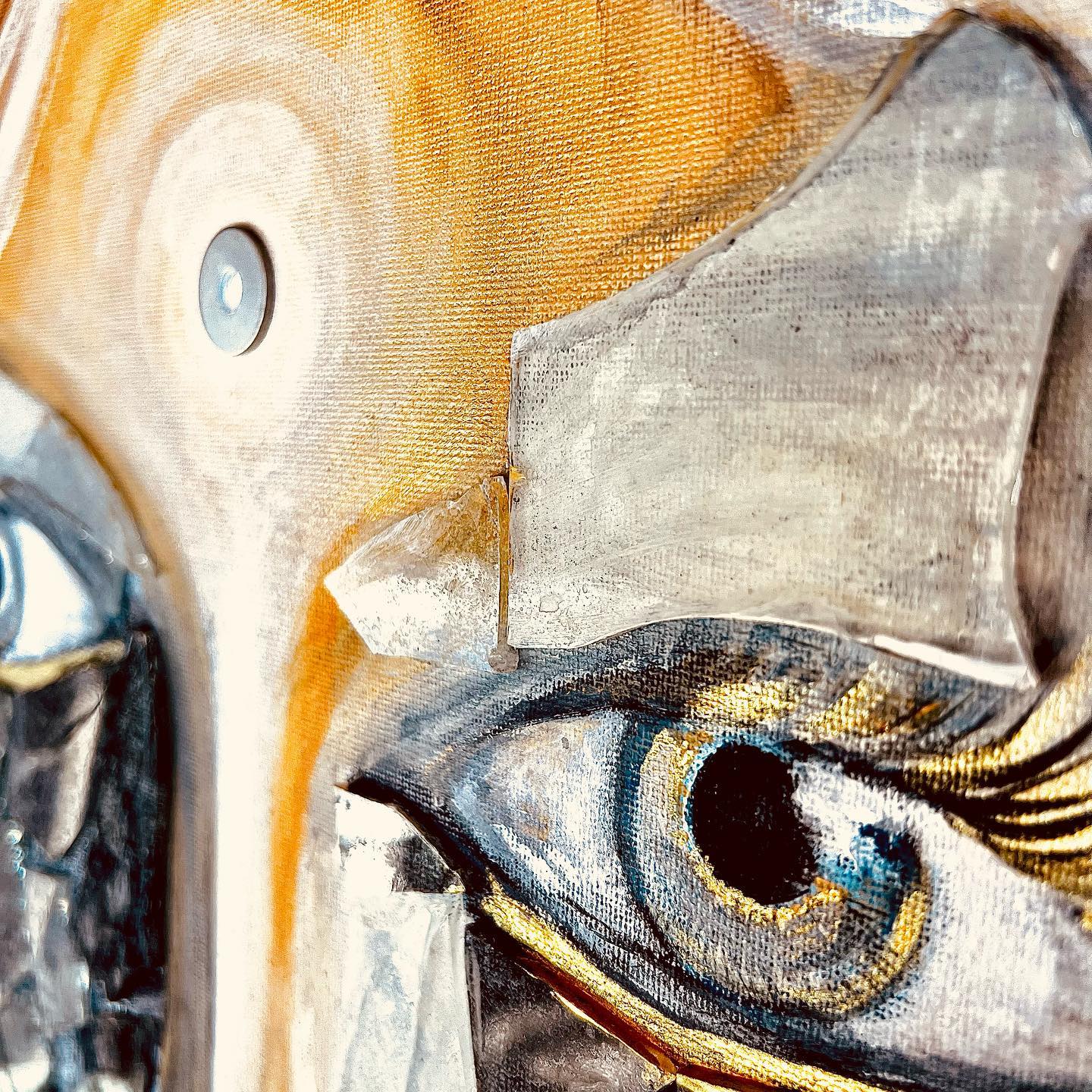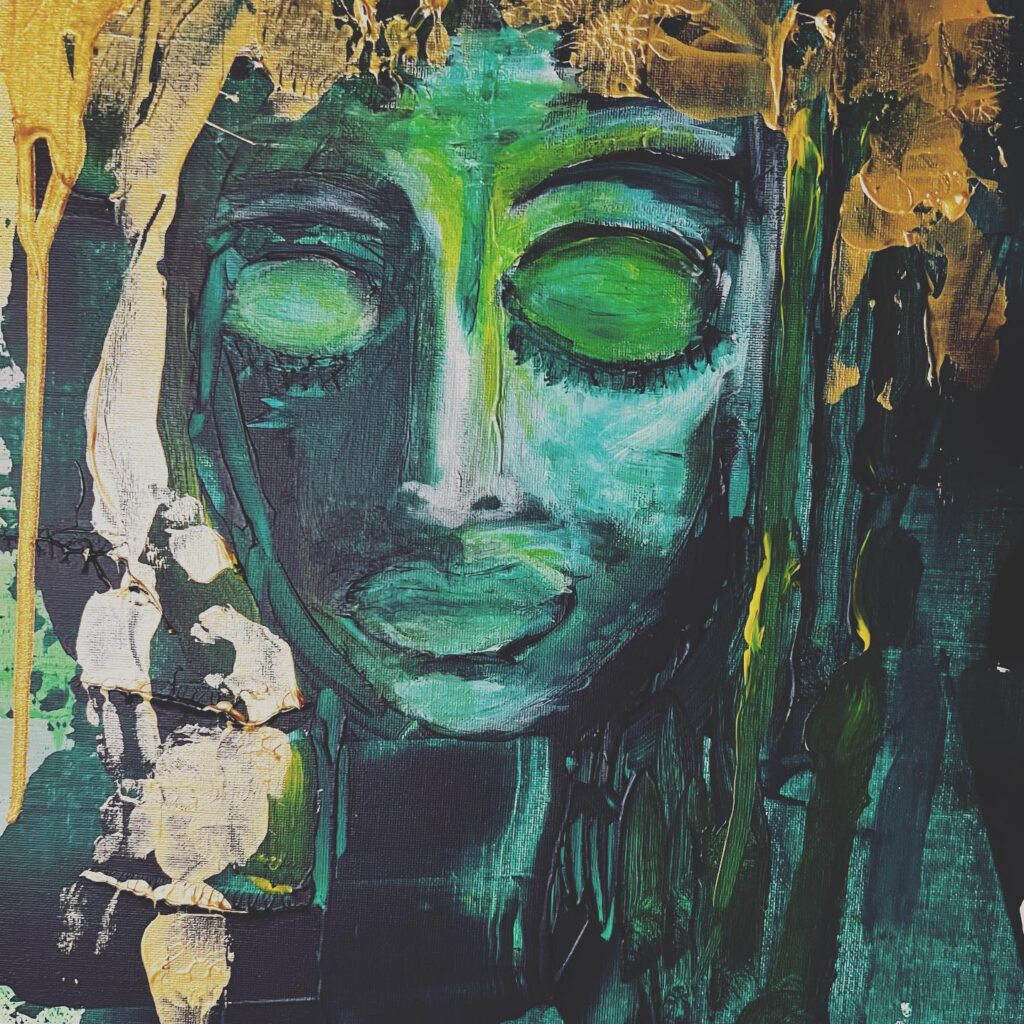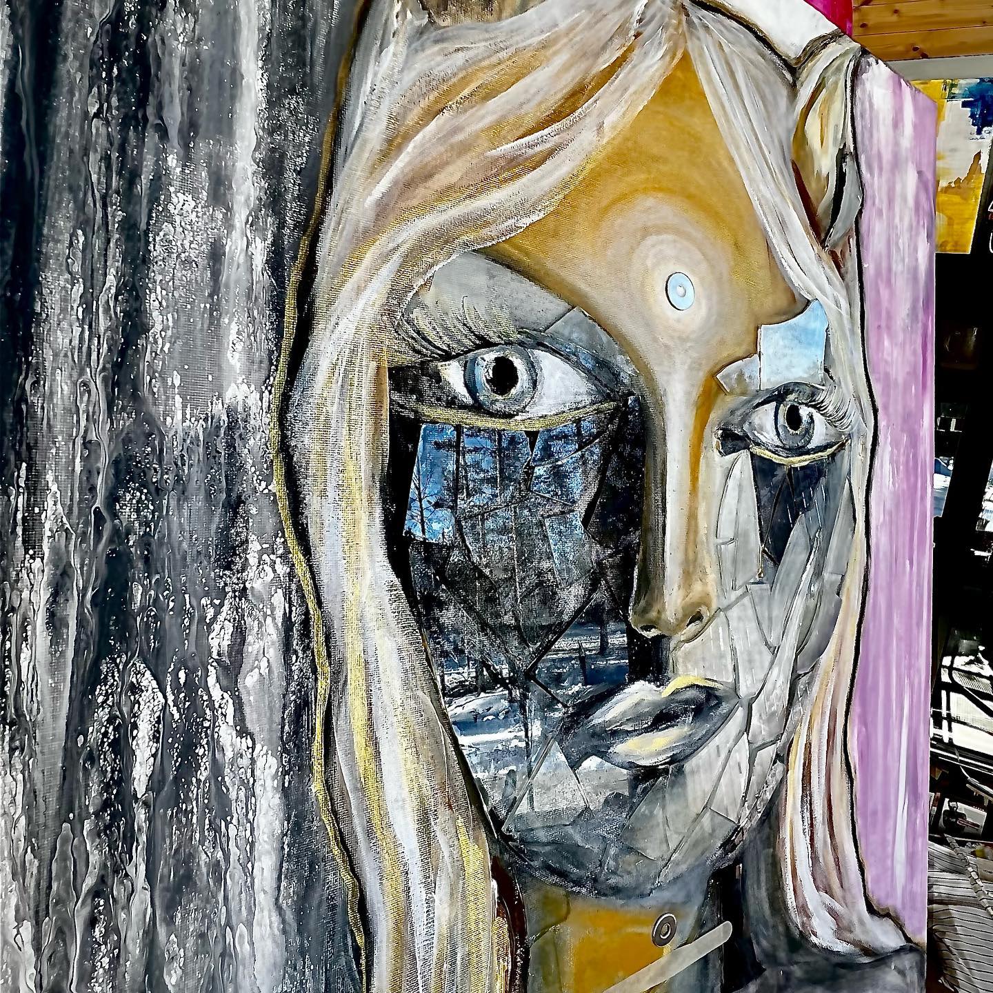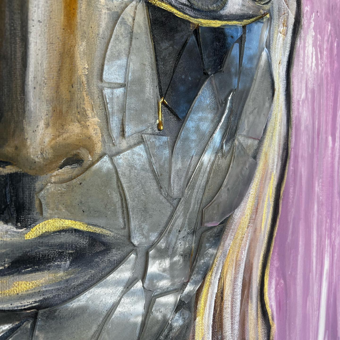 Omakuva. Canvas. Sekatekniikka mm. akryyli, lasinsirut ym. Koko 80×100.